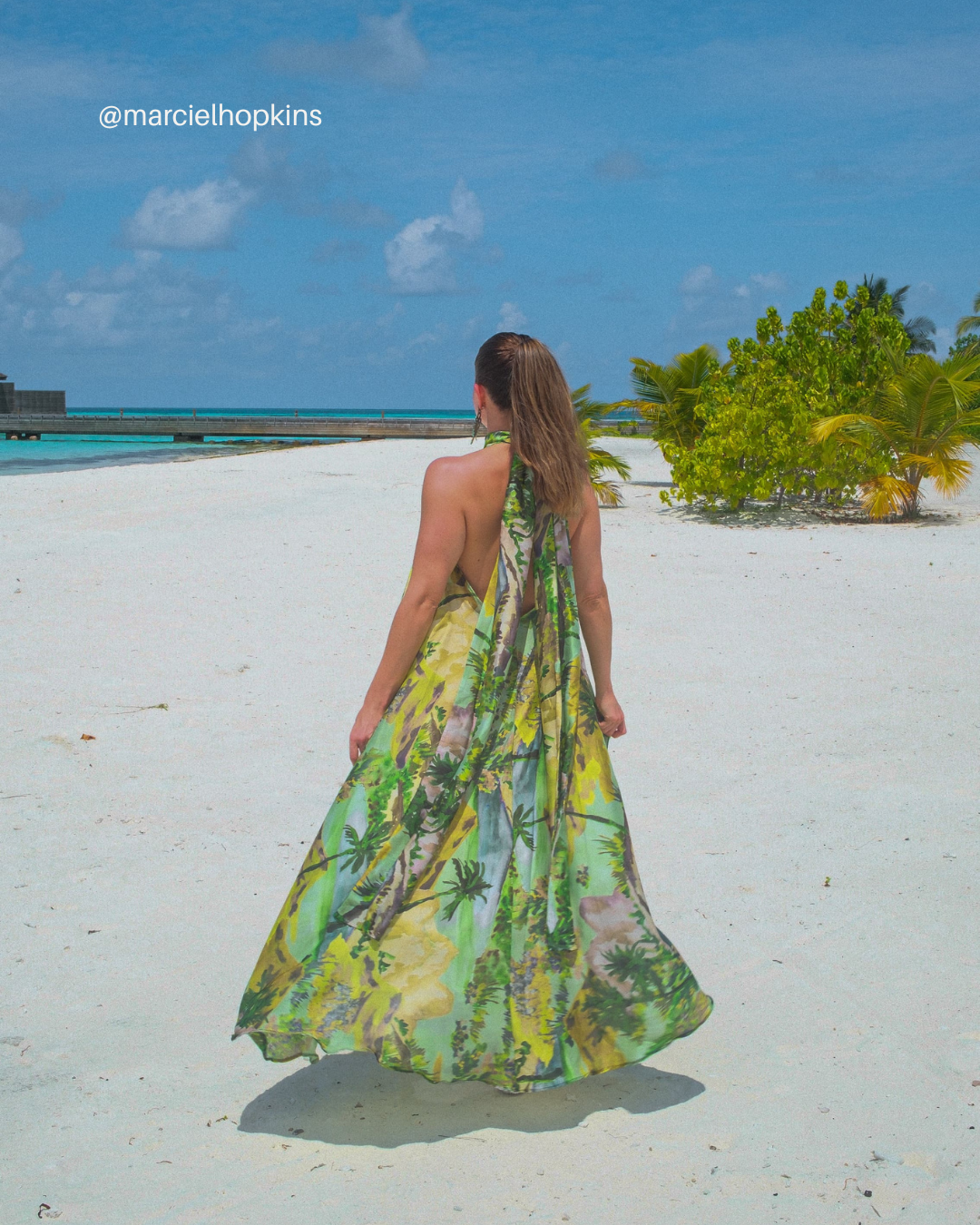 Cut in luxe fabric that drapes like a dream, our Aquarius Dress features a halter neckline and long ribbon ties for a floaty, feminine silhouette. The tented maxi cut makes this the ultimate statement in ease and elegance — made for golden hours and barefoot evenings.