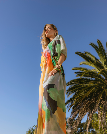 Our Long Kaftan is a flowing, floor-grazing silhouette crafted in a soft silk-blend for an elevated take on effortless summer dressing. Featuring a plunging neckline, adjustable waist tie, and soft-tapered sleeves, she floats with you from beachside mornings to balmy evening soirées. Finished with a knee-high slit for movement and flow.