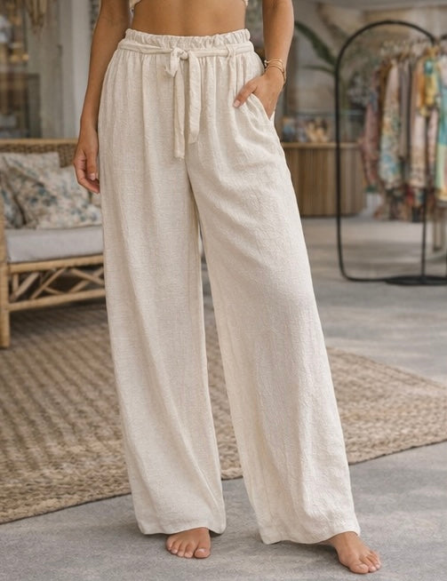 These wide legged palazzo pants bring out your most on holiday self - a relaxed wide fit, with elastic waistband with a tie detail - they pair wonderfully with a kimono or the Corsica top for the perfect resort look.