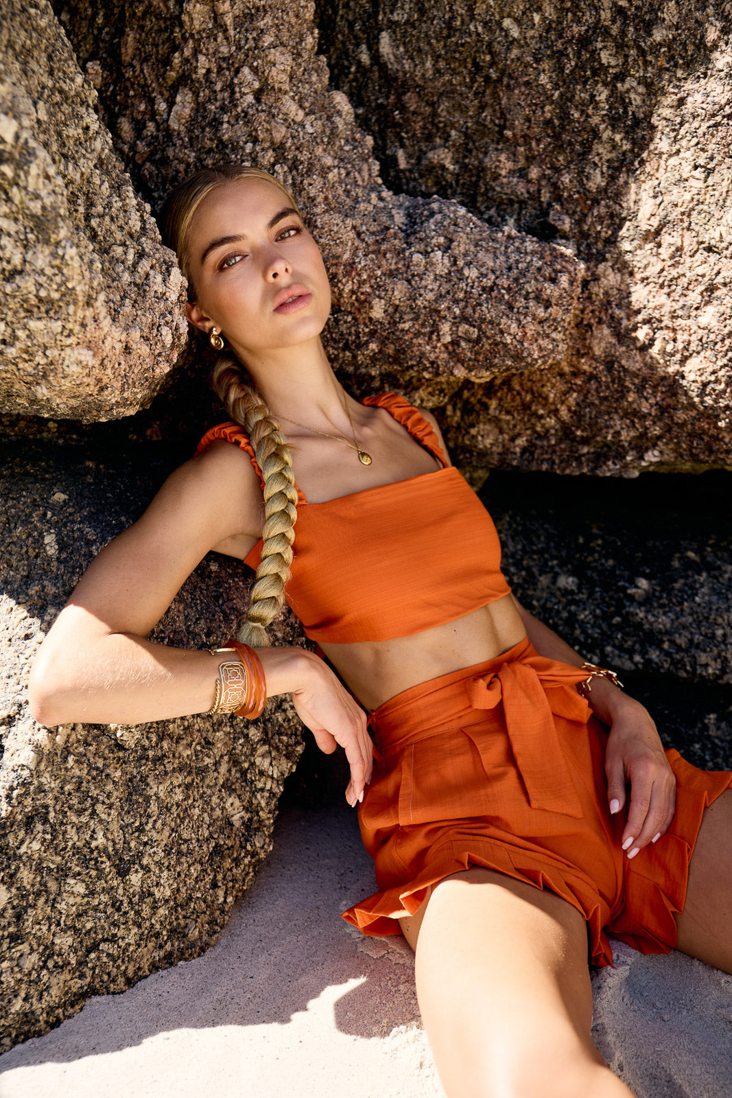Fun, easy and reversible. This little top with ruched sleeves and a centre front tie detail will elevate any look. Try it backwards for a completely different look.