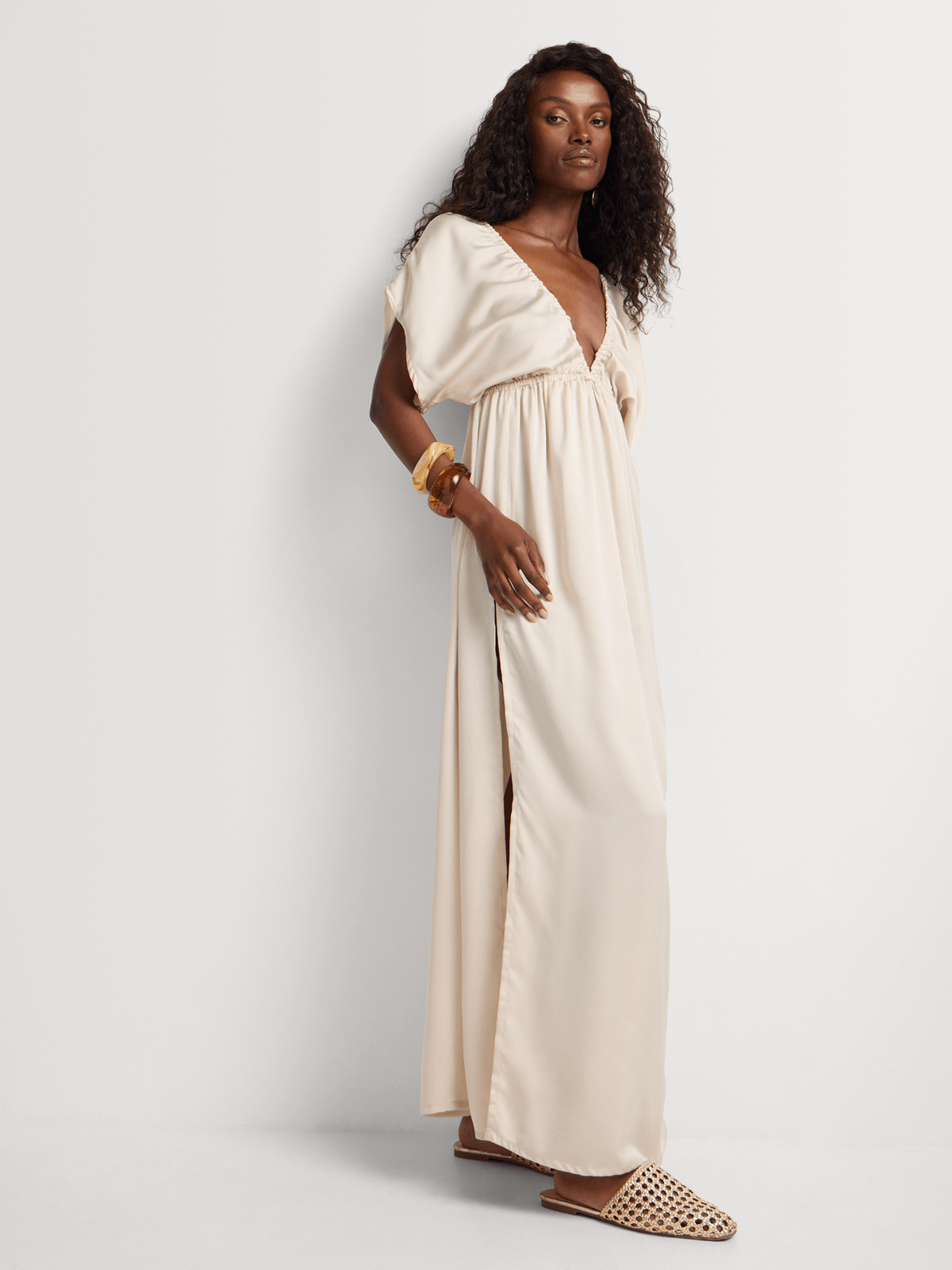 A sun-drenched slip made for balmy escapes. The Sardinia Dress is all flowing lines and fluid femininity — featuring a deep V neckline, softly winged sleeves that drape to just above the elbow, and elastication under the bust that cinches gently for shape.
