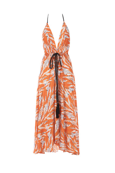 The Ibiza Dress is designed with a deep V neckline, plunge back, and adjustable straps with playful tassel details. Falling to a midi length, this dress offers a flattering fit with ties that can be adjusted to suit your style, taking you effortlessly from beach to evening.