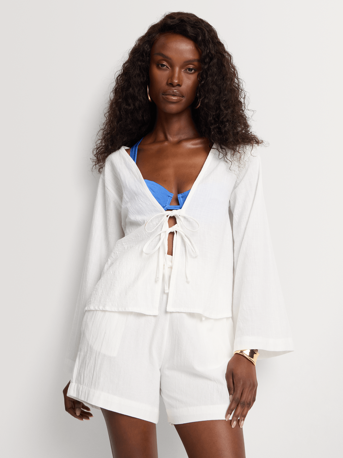 Our Quinn Shirt features delicate tie-front detailing and subtly flared sleeves for an airy, feminine feel. Wear loose with matching Quinn Shorts, or half-tucked into our Positano Pants for an undone yet elevated mood.