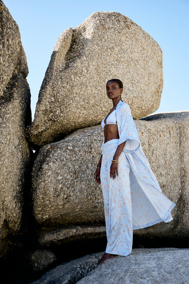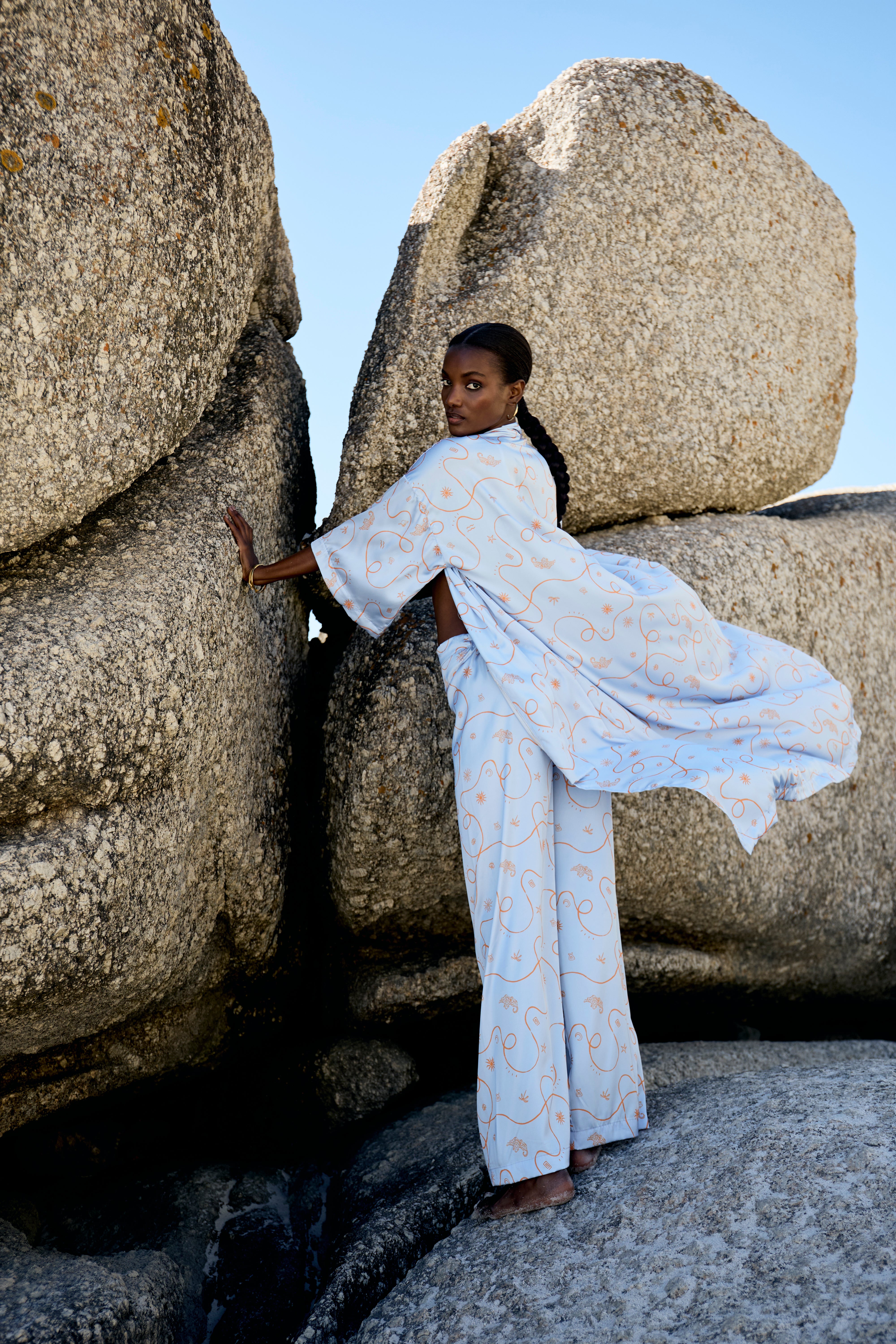 Elevate your style with the Apollo Kimono, a stunning piece that adds a touch of drama to any outfit. Its midi length and wide waistband, which can be doubled as a stylish headband, create a chic and versatile look. Pair it with matching corsica pants for a sophisticated ensemble or throw it over your swimsuit for a chic beach day.