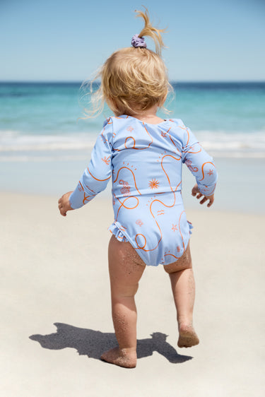 A sweet long-sleeved one-piece designed for little beach explorers. With a high crew neck, full bum coverage (perfect for nappies or extra playtime comfort), and delicate ruffle trim at the legs, it’s made for splashing, sandcastles, and sunny days by the sea.
