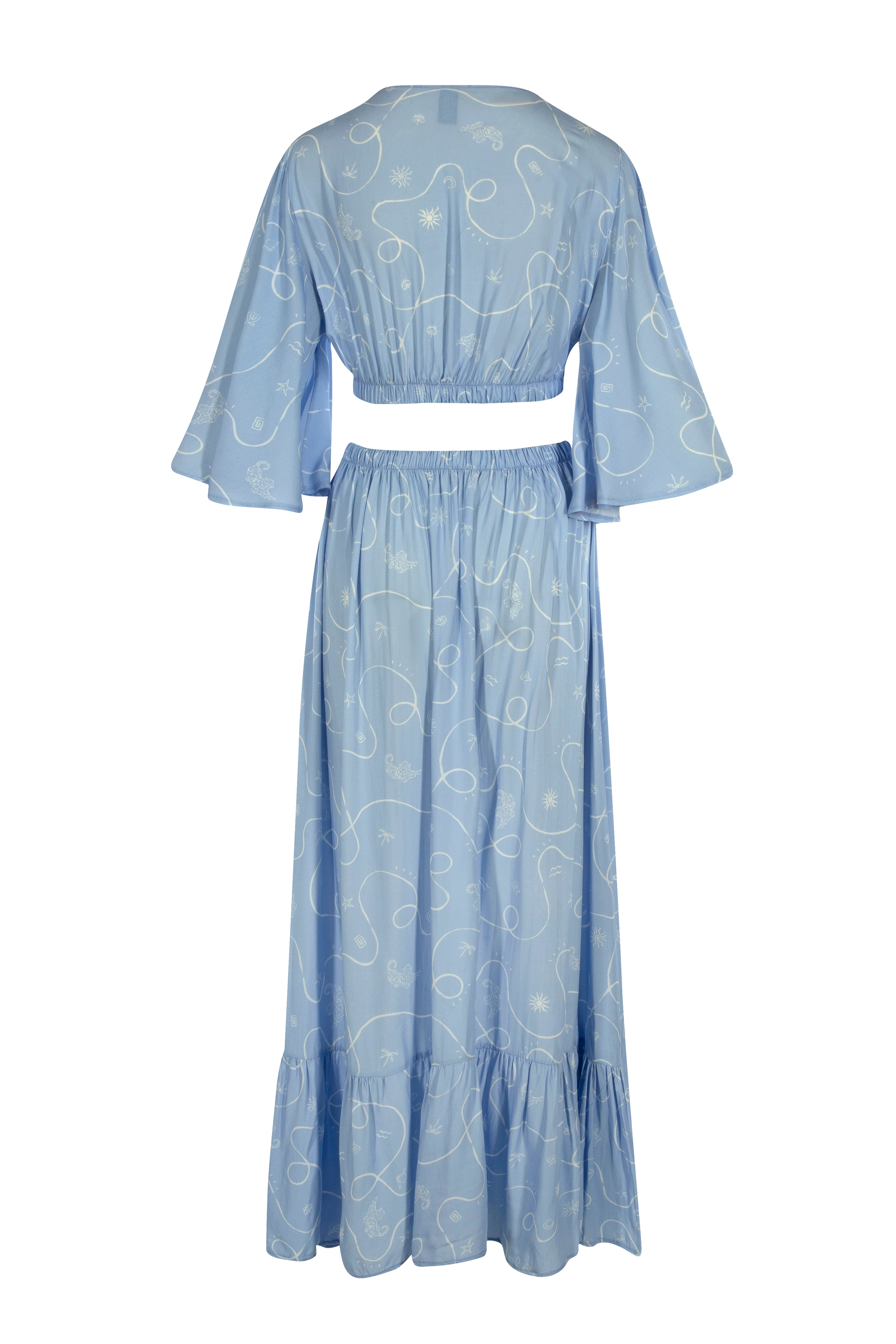 Marina features soft ivory lines drift across a sky blue base. Studio Pen’s hand-drawn BeachCult inspired motifs - swirling lines, abstract suns, tigers, and palms - create a playful, bohemian luxe feel.